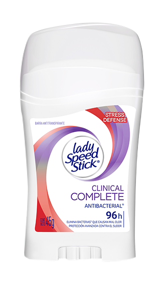 Lady Speed Stick® Clinical Complete Protection bloquea sudor y combate mal olor. Protege hasta 96 horas sin residuos o mal olor en la piel.