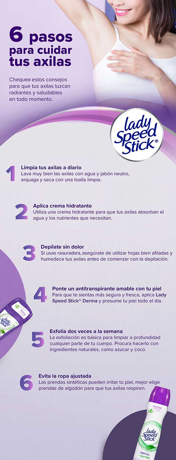 Sigue estos consejos y te sentirás mucho más segura y confiada a la hora de mostrar tus axilas. Pero recuerda que todas las axilas son diferentes y lo más importante es tenerlas sanas y protegidas. Por eso elige un antitranspirante que te permita ser tú misma y estar cómoda en todo momento.