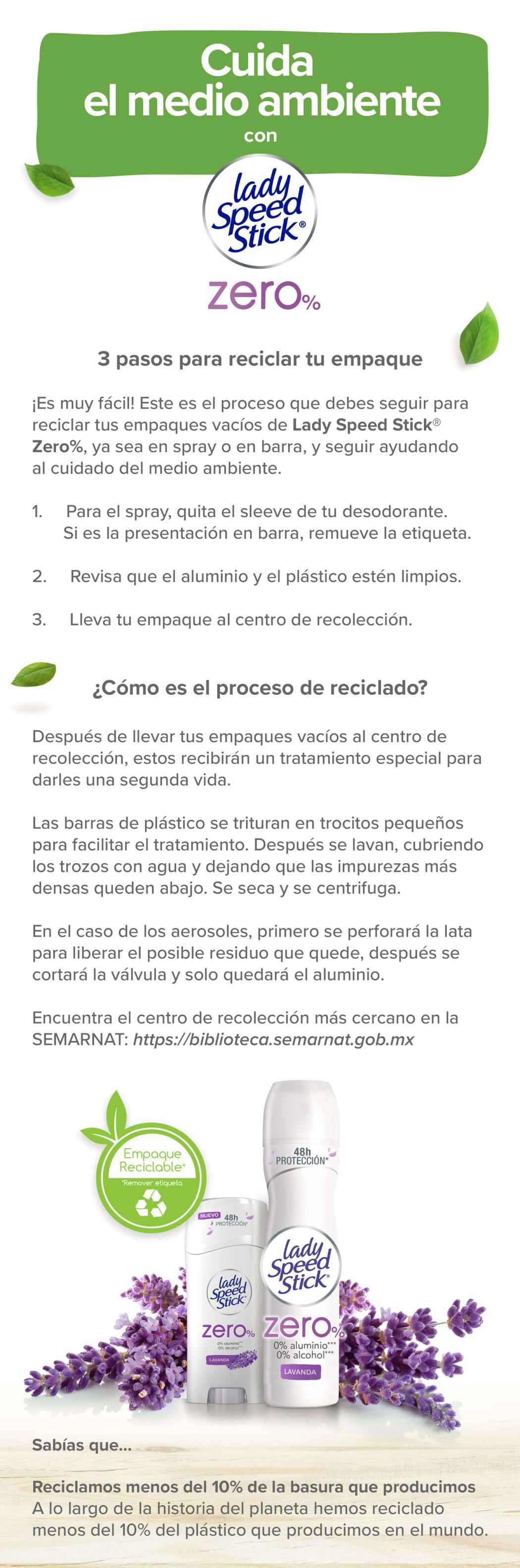 Siguiendo este compromiso para cuidar al planeta surgen los empaques reciclables, es decir, envases que después de uso principal se pueden convertir en otro material o producto para darles un nuevo uso. Esto ocurre con los empaques de Lady Speed Stick®Zero%, ya que son fabricados con resina 100% virgen y en el caso de las latas de aluminio, se fabrican con 99.1% de aluminio virgen.